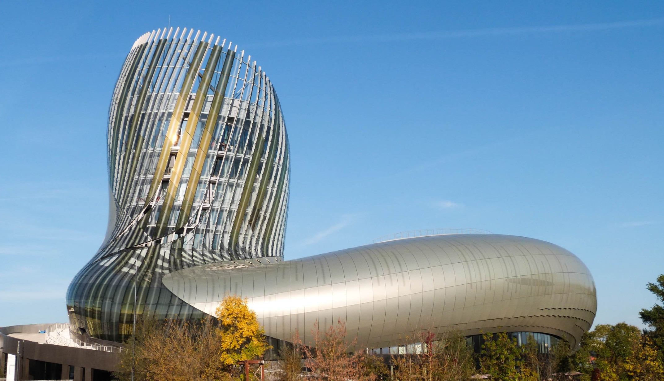 葡萄酒城于 2016 年落成,其不寻常的形状很容易辨认,象征着多节的葡萄藤,“让人想起玻璃杯中转动的葡萄酒和与场地接壤的加龙河的漩涡”。