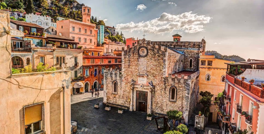 陶尔米纳大教堂是这座城市最著名的地标之一。 它与附近大教堂广场上的喷泉一起,成为陶尔米纳拍照最多的角落之一。 这座建筑始建于 13 世纪,在随后的几个世纪里曾多次改建。 其入口处的门廊是真正的杰作。这座建筑在 15 世纪和 16 世纪经过多次改建,18 世纪由那不勒斯建筑师阿曼多-狄龙(Armando Dillon)进行了修复。 1945 至 1948 年间,那不勒斯建筑师阿曼多-狄龙对陶尔米纳大教堂进行了修复,拆除了内部的巴洛克式灰泥装饰。 目前的外观是一座 "ecclesia munita",即 "要塞教堂"。 事实上,这里有一些典型的防御工事建筑元素,如教堂外立面上的雉堞和教堂后面的堡垒塔。 教堂的正立面装饰着一扇文艺复兴时期风格的大型玫瑰窗,由穿孔的锡拉丘兹石制成。 另外两个玫瑰窗分别位于东、西立面。